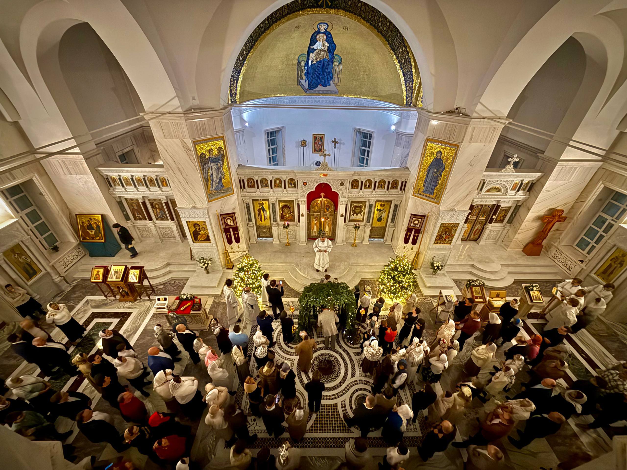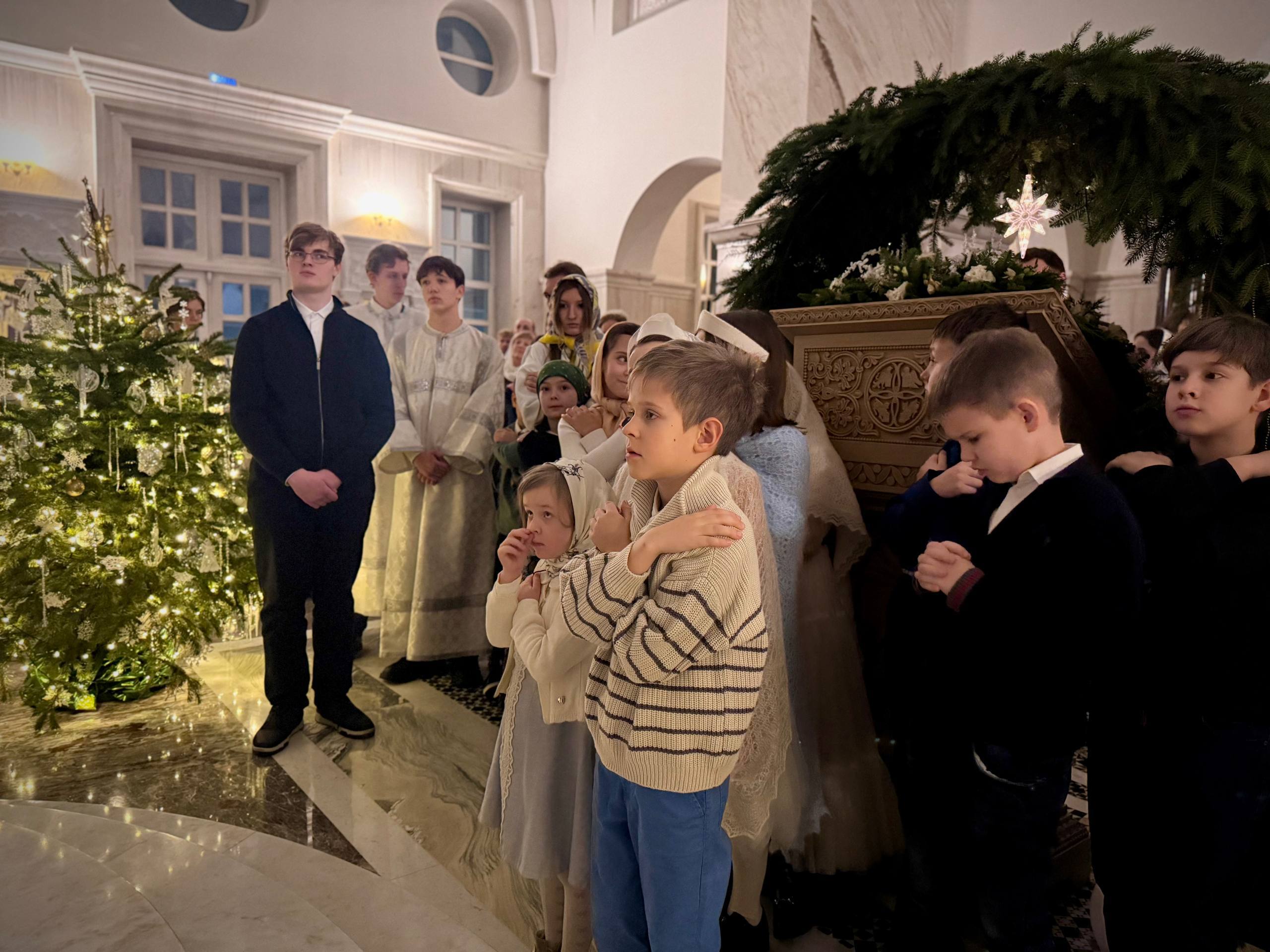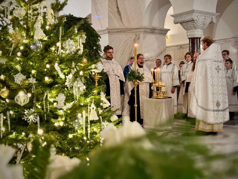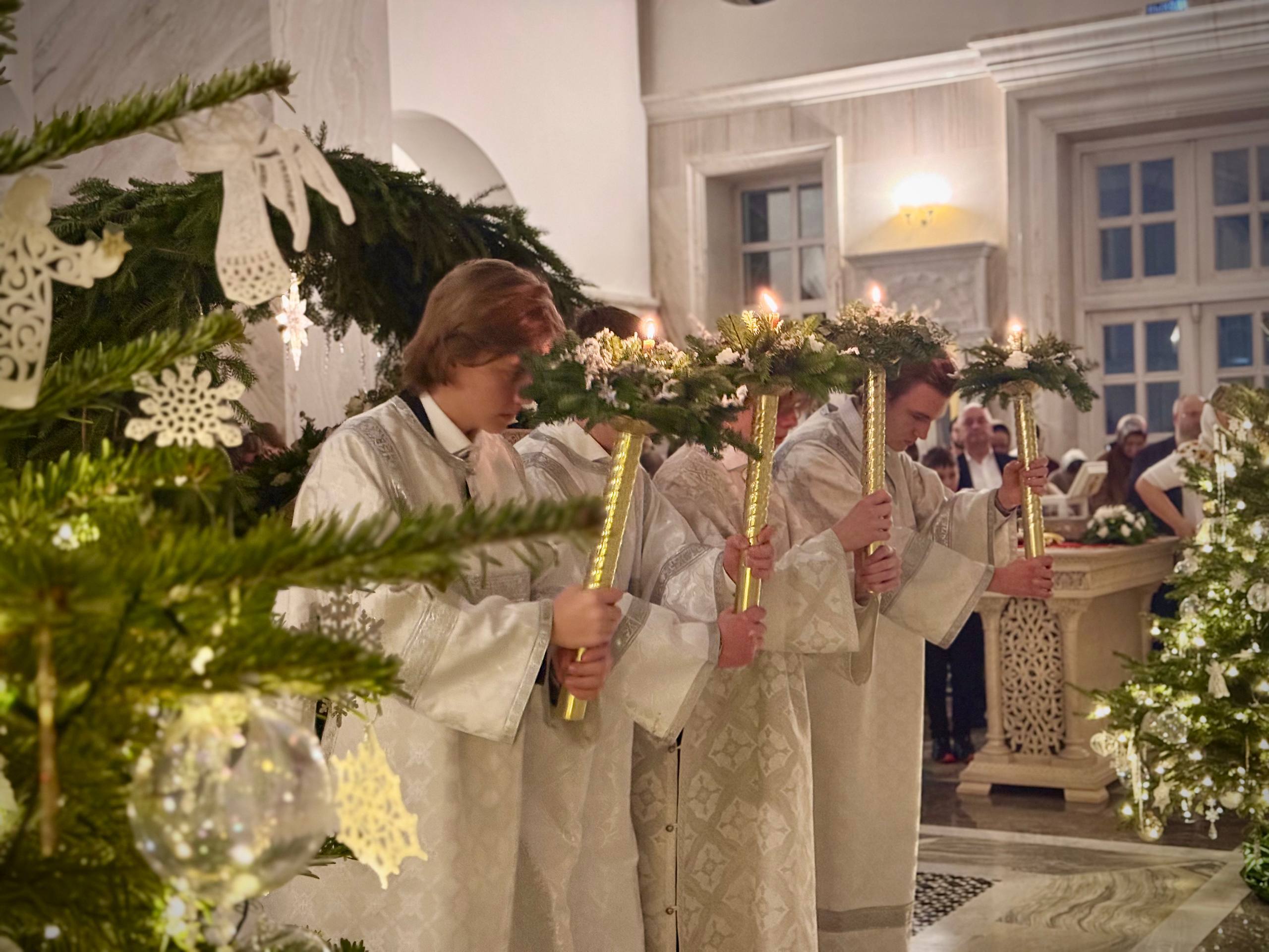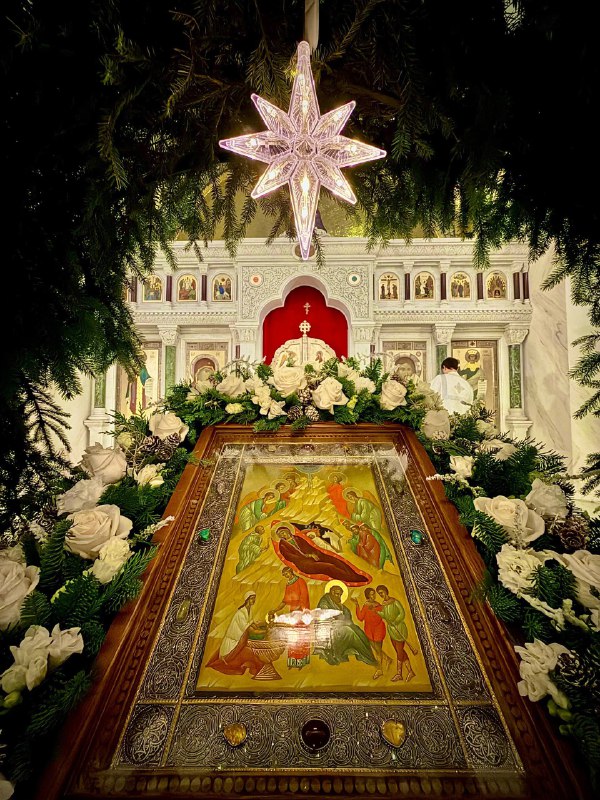 Рождество́ Твое́, Христе́ Бо́же наш, возсия́ ми́рови све́т ра́зума, в не́м бо звезда́м служа́щии звездо́ю уча́хуся Тебе́ кла́нятися, Со́лнцу Пра́вды, и Тебе́ ве́дети с высоты́ Восто́ка. Го́споди, сла́ва Тебе́.Христос рождается!