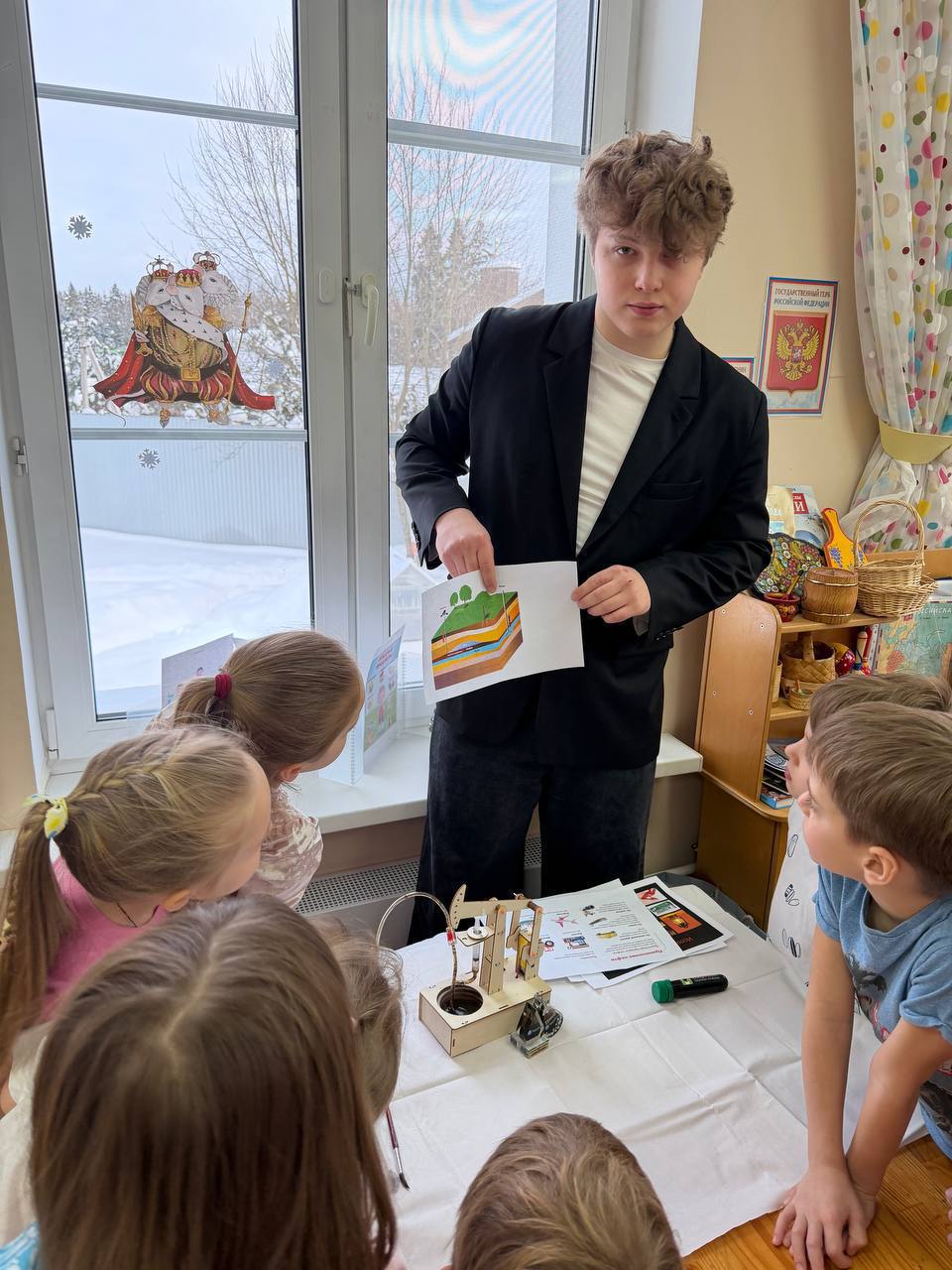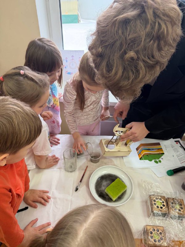 Особый интерес вызвал рассказ о способах добычи нефти. Чтобы объяснить, как она залегает в горных породах, школьник использовал губку с вишнёвым соком и макет нефтяной качалки, наглядно показав процесс «извлечения» жидкости из пористого материала. Такой опыт помог ребятам легко понять сложную тему.