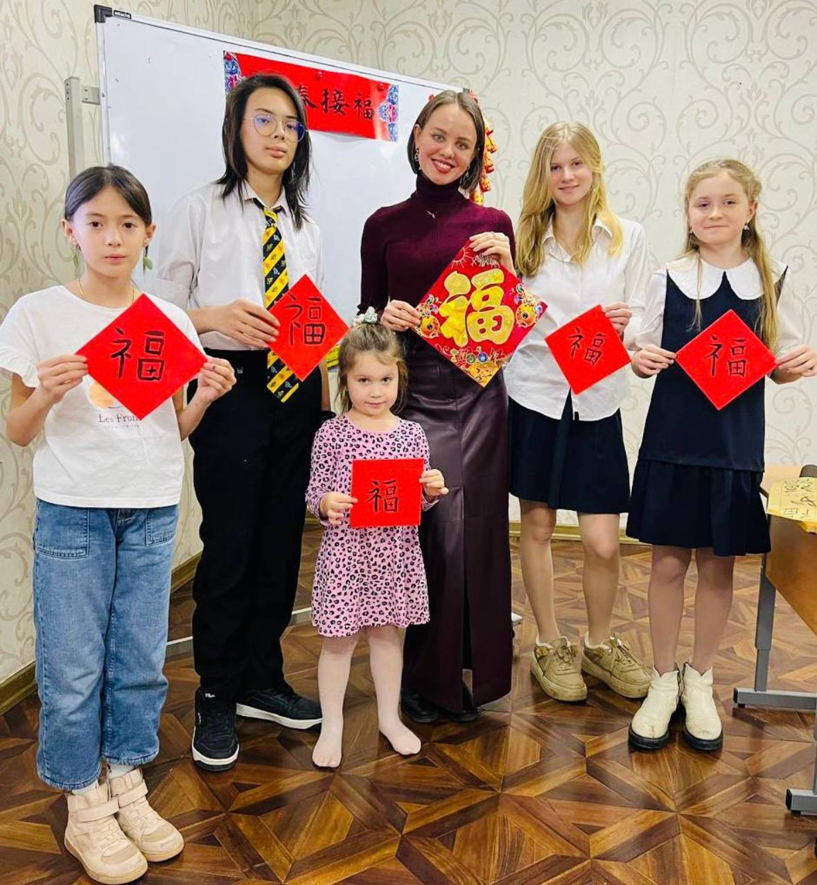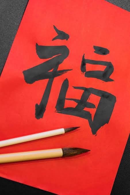 напишем пожелания с Новым годом, а также иероглиф 副 - «счастье» - тушью на квадрате красной бумаги (главная традиция китайского Нового Года).