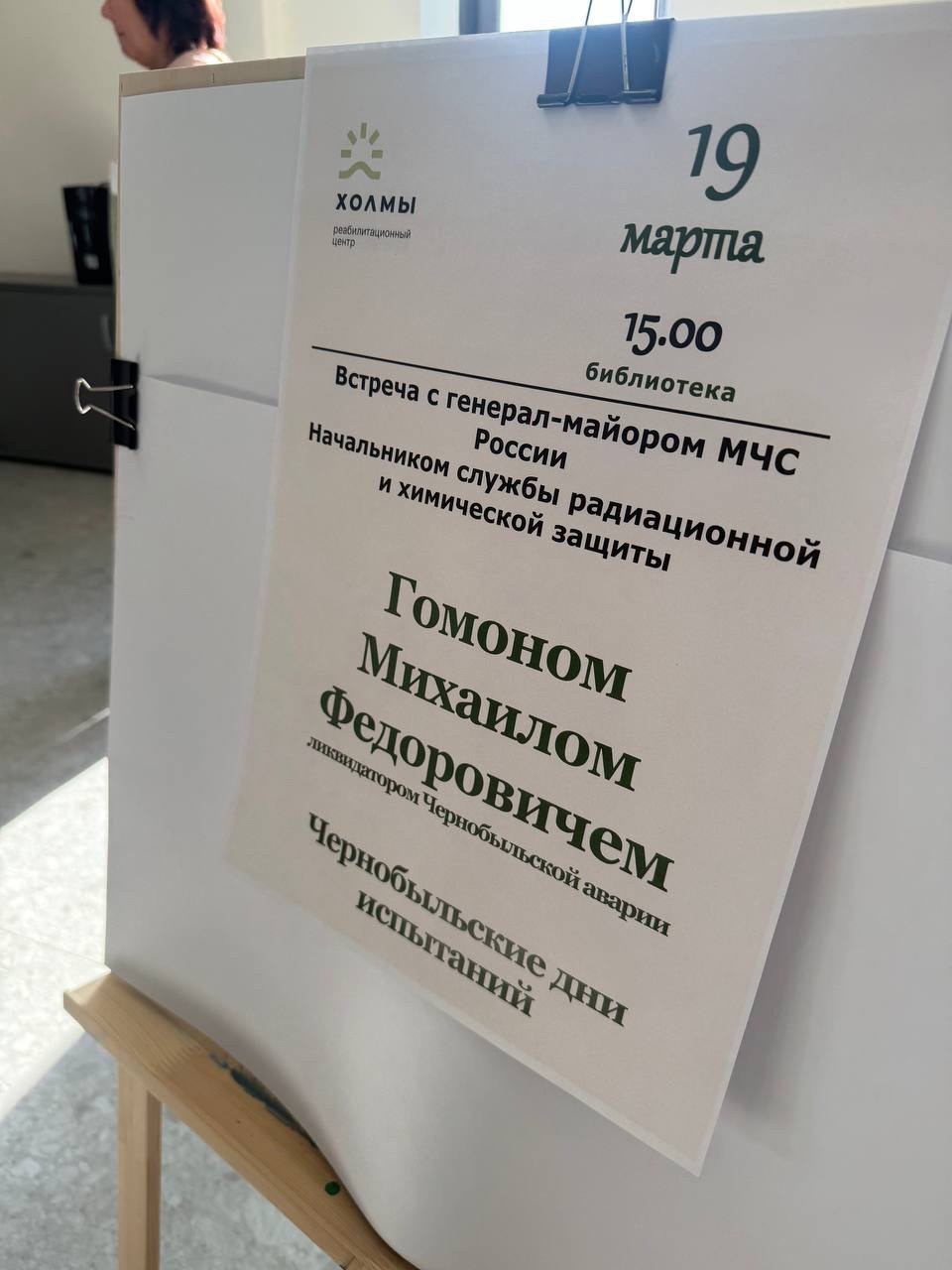 В рамках учебной четверти, посвященной факультету «Гамма», для Гимназистов организуются встречи с интересными людьми. Ученики 8–9 классов посетили реабилитационный центр, где познакомились с ликвидатором последствий аварии на Чернобыльской АЭС генерал-майором МЧС Михаилом Федоровичем Гомоном. Беседа получилась разноплановой - от интересных фактов из жизни Михаила Федоровича до анализа событий Чернобыльской аварии.