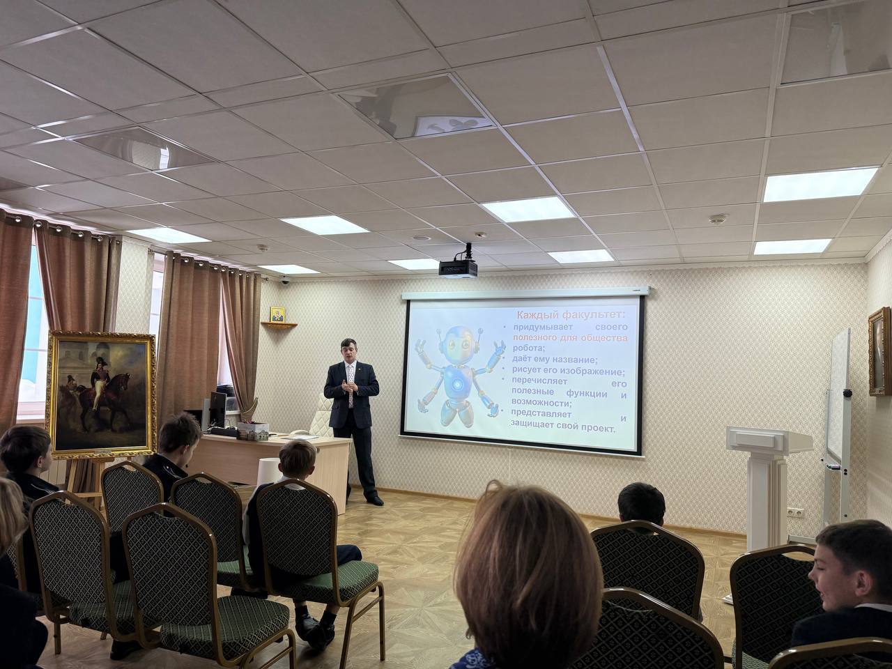 В четверг состоялся факультетский час, на котором команды Альфы, Беты, Гаммы и Дельты разрабатывали собственные модели социально полезного робота: продумывали его специализацию, прорабатывали функции и детали внешнего вида, а затем представляли и защищали свой проект перед товарищами.