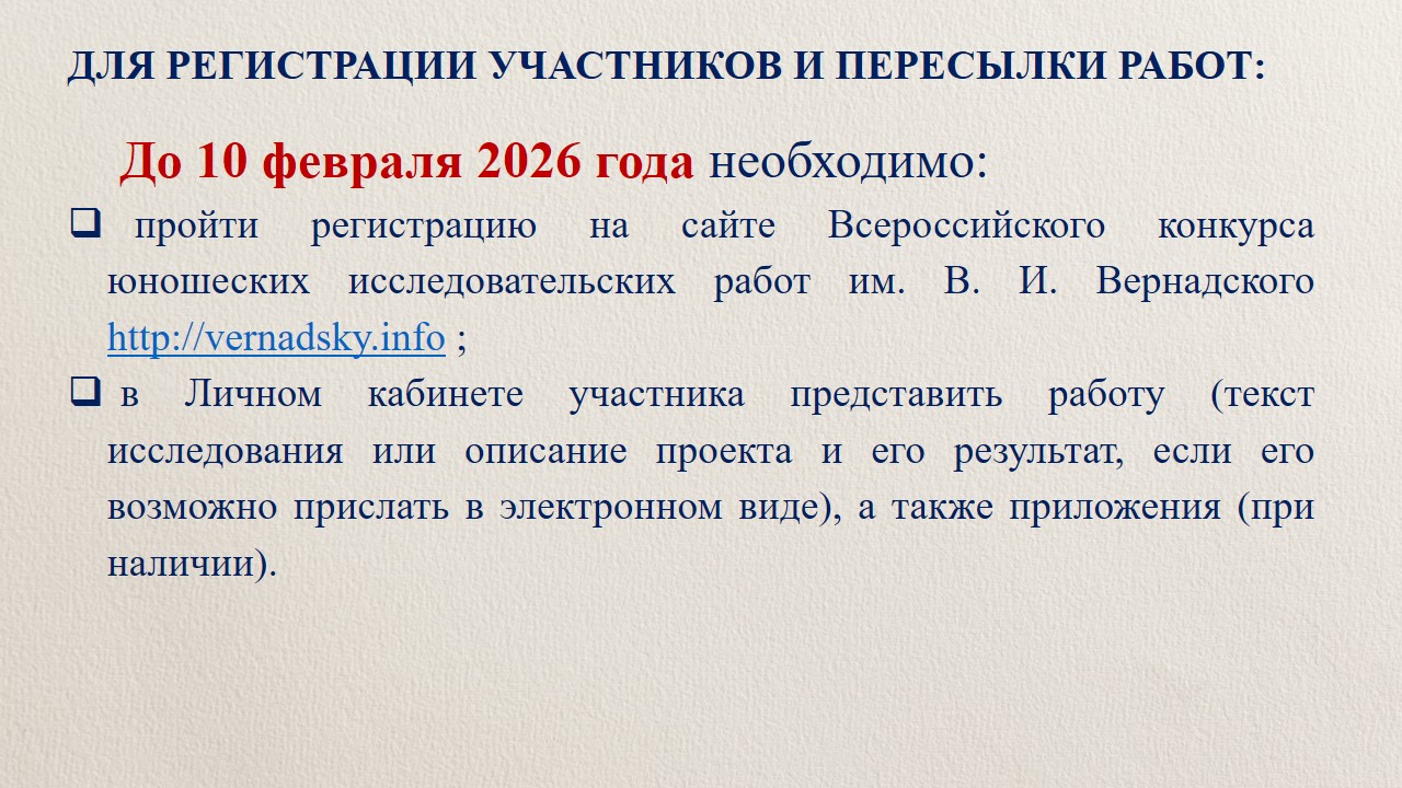 Конкурс проходит в рамках Всероссийского конкурса юношеских исследовательских работ им. В. И. Вернадского, который входит в «Перечень олимпиад и иных интеллектуальных и творческих конкурсов … на 2025/26 учебный год», утверждённый Минпросвещения РФ (Приказ № 639 от 31.08.2025 г., п. 6.246).