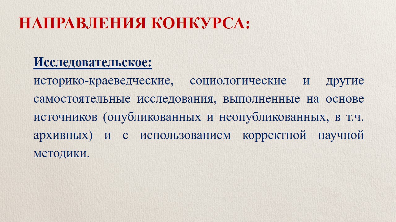 1. исследовательское, к которому относятся историко-краеведческие, социологические и другие самостоятельные исследования, выполненные на основе источников (опубликованных и неопубликованных, в т.ч. архивных) и с использованием корректной научной методики;