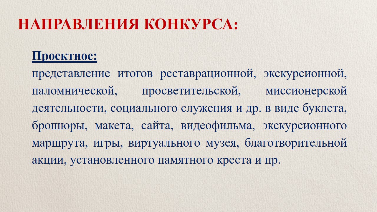 2. проектное, которое подразумевает работу авторов над конкретным практическим результатом в рамках тематики Конкурса (буклет, брошюра, макет, сайт, видеофильм, экскурсионный маршрут, игра, виртуальный музей, организация праздника или благотворительной акции, установка памятного креста и пр.).