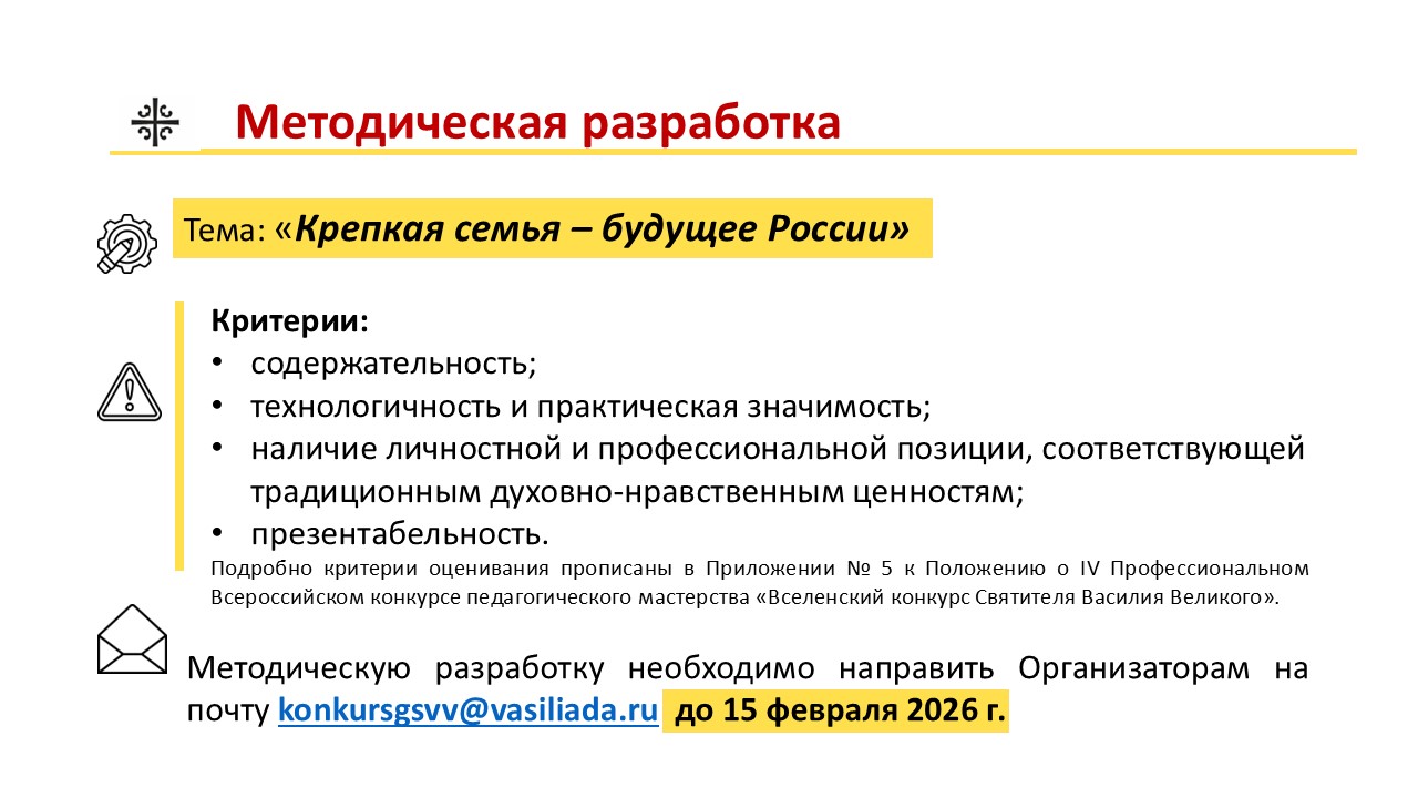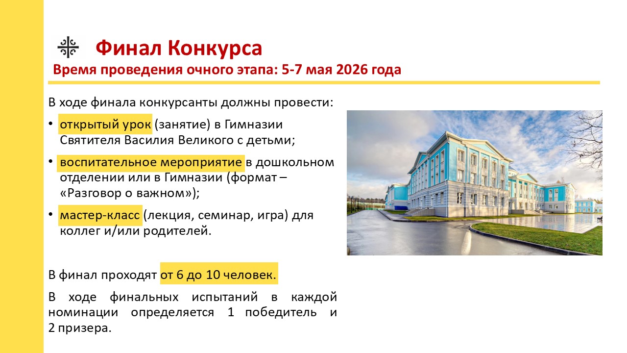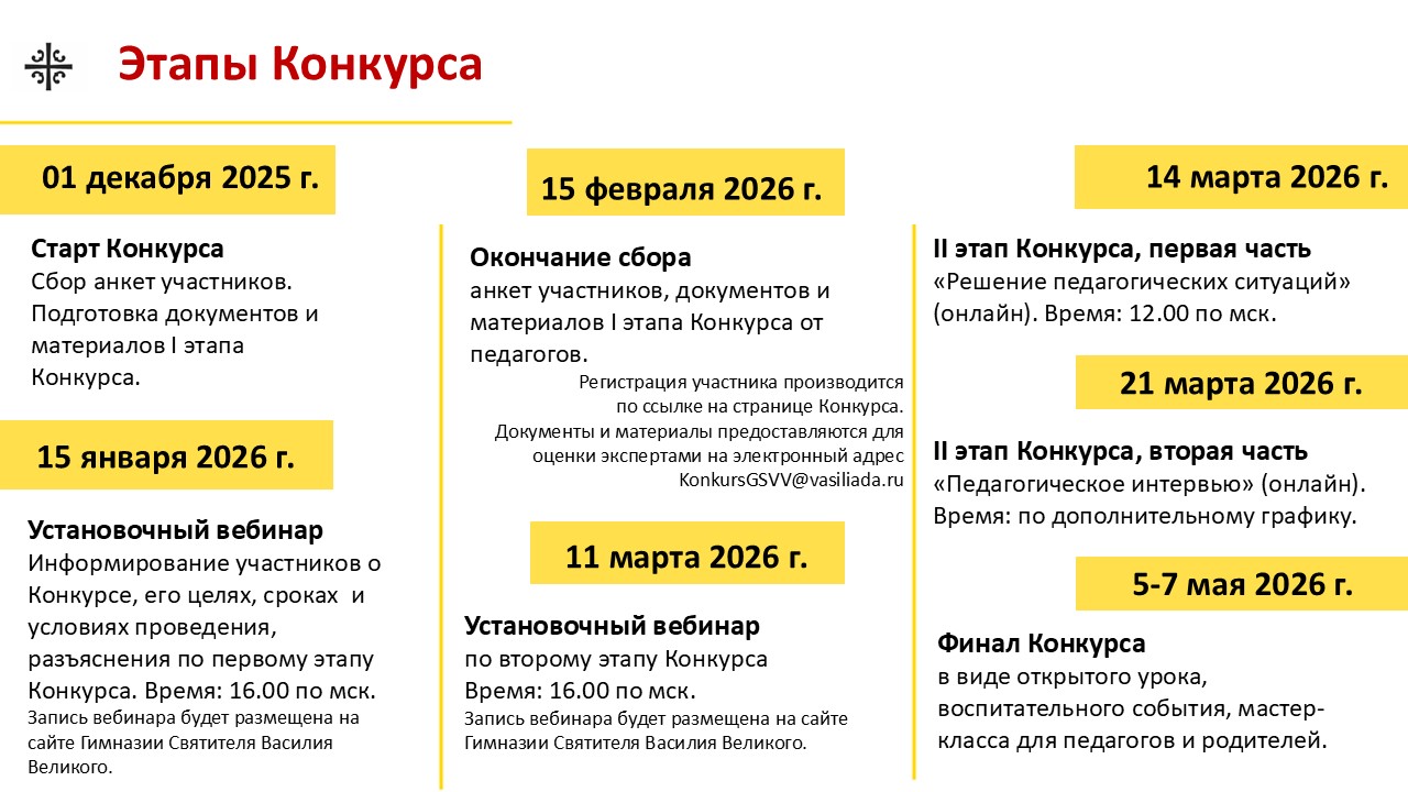 С 1 декабря 2025 г. по 7 мая 2026 г. в Гимназии Святителя Василия Великого (Московская область, Одинцовский р-н, дер. Зайцево, Кокошкинское шоссе, 1) будет проходить IV Профессиональный Всероссийский конкурс педагогического мастерства «Вселенский учительский конкурс Святителя Василия Великого».