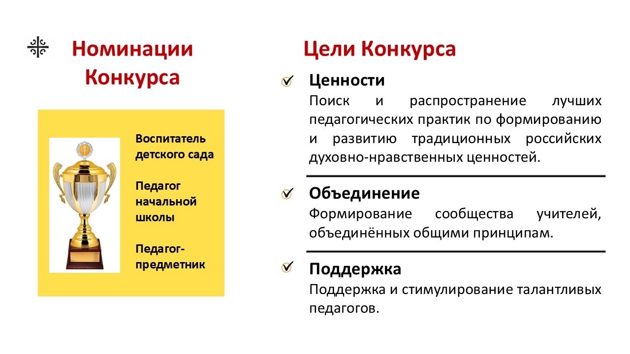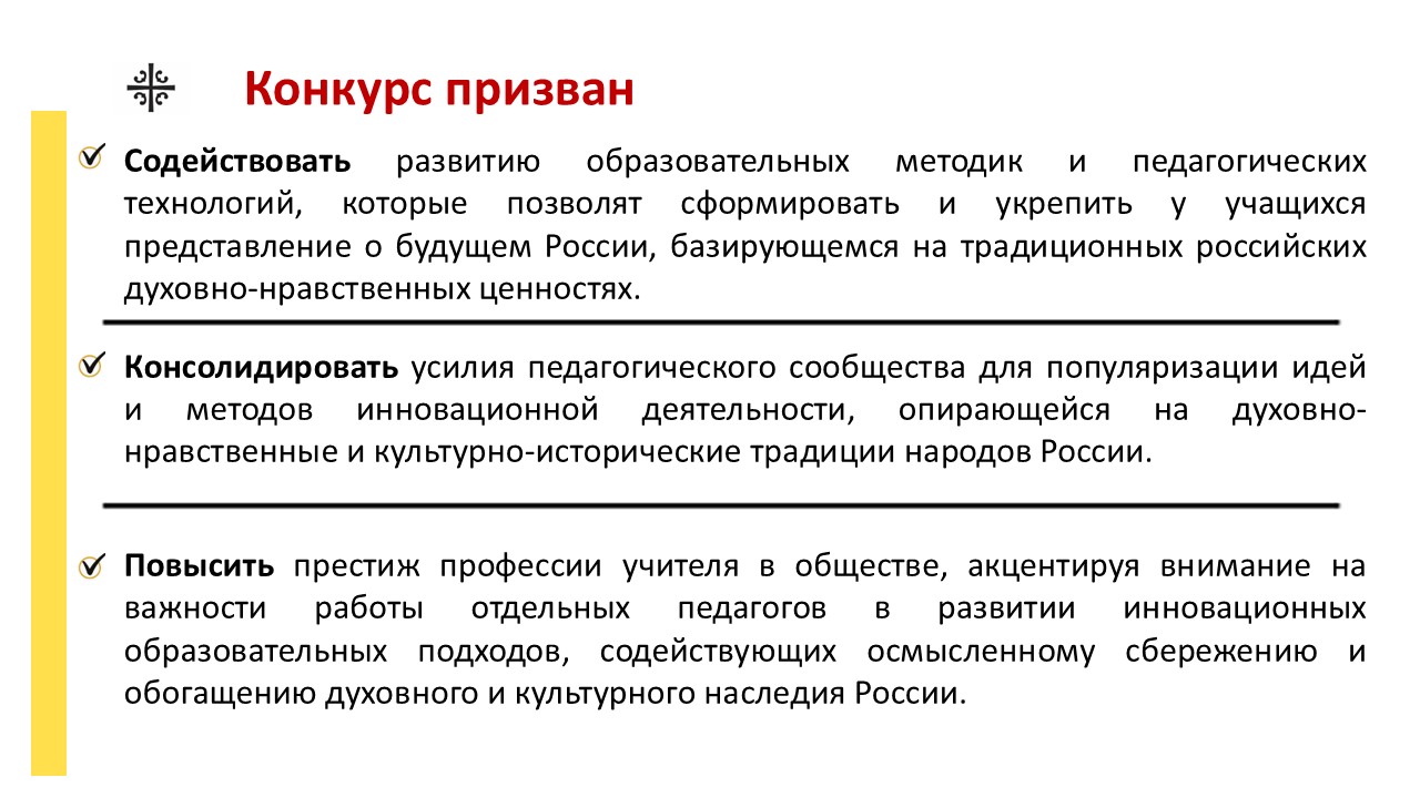 Главные цели Конкурса: поиск и распространение лучших педагогических практик по формированию и развитию традиционных российских духовно-нравственных ценностей; формирование сообщества учителей, объединённых общими принципами; поддержка и стимулирование талантливых педагогов.