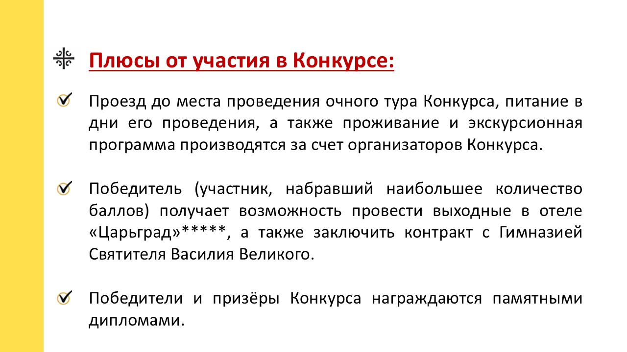 Проезд, проживание и питание участников финала Конкурса оплачивается Организаторами Конкурса. Победитель Конкурса получает возможность провести выходные в отеле-курорте «Царьград». Победители и призёры Конкурса награждаются памятными дипломами.